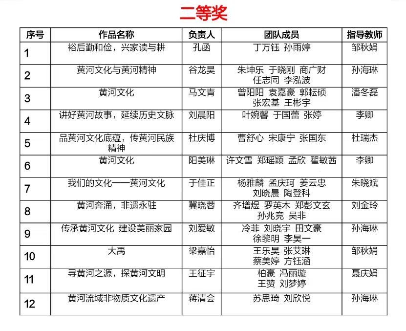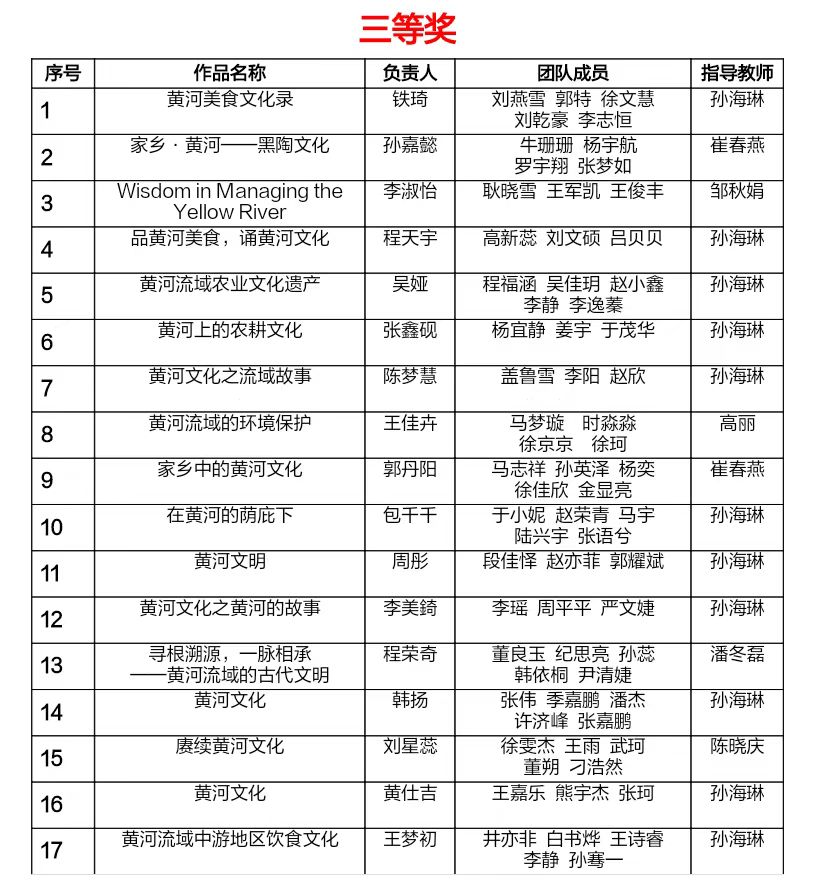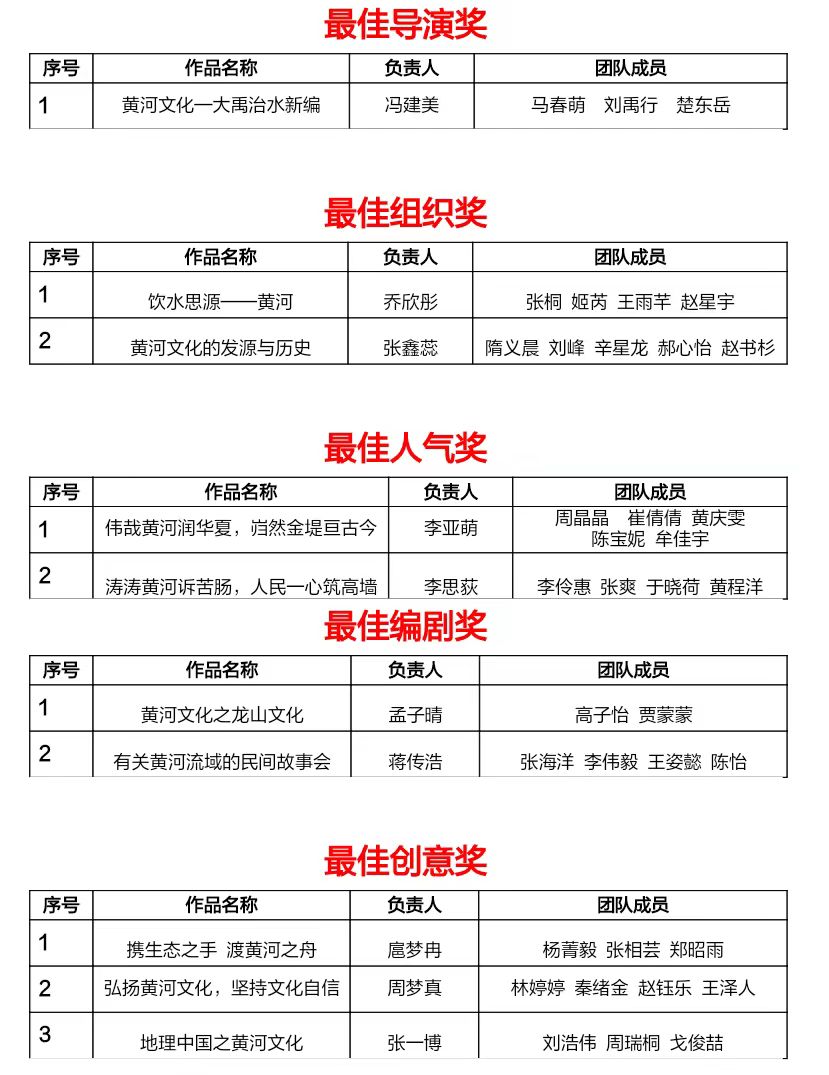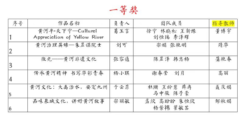 青岛农业大学第三届大学生英语创新大赛•英语微视频创作大赛(黄河文化专题)自5月份启动以来,吸引了全校18个学院共计287名学生参加,59支队伍提交参赛作品。经过网络投票和专家评审,共评选出一等奖6项,二等奖12项,三等奖17项;最佳导演奖1项,最佳组织奖2项,最佳人气奖2项,最佳编剧奖2项,最佳创意奖3项。现将获奖名单公布如下: