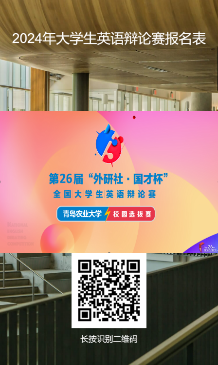 为进一步提高大学生的跨文化交际意识、提升英语表达能力和思辨能力、弘扬英语实践能力和团结协作精神,加强高校校园文化建设,帮助学生开拓国际视野、激发大学生的英语学习兴趣,培养兼具家国情怀和全球视野的国际沟通与传播人才,学校将举办青岛农业大学2024大学生英语辩论大赛。现将有关事宜通知如下: