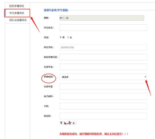 注:①院校参赛代码(各校代码唯一,共18位),本科生:202210181502082975;研究生:202210181507036624,请同学们确认好组别,填写正确的代码,否则将影响比赛结果。②参赛学生务必选择好自己所在的参赛组别,否则视为无效信息。③登录网考系统时,需要输入本人手机号码和手机接收到的短信验证码才能进入网考页面,因此,报名时填报的手机号码一定要填本人现在正常使用的号码。