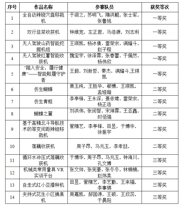 为培养学生创新精神和实践能力,拓展实践教学内容的深度与广度,提升高等教育质量和服务社会能力,依据第二十一届(2024年)山东省大学生机电产品创新设计竞赛暨第十一届全国大学生机械创新设计大赛山东赛区通知要求,太阳于2024年3月19日举办了青岛农业大学大学生机械创新设计大赛。本次大赛由创新太阳成集团tyc234cc主办,机电工程学院承办,共有52支队伍225名本科生报名参加本次大赛,通过专业培训、材料审核和现场答辩,评审专家从结构合理性 、设计图纸质量 现场问答等方面对各参赛队作品进行了综合评定,大赛最终评选出一等奖5项、二等奖5项、三等奖4项,现将获奖名单公布如下: