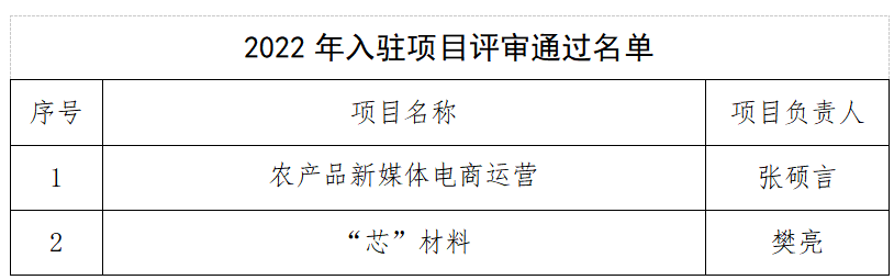 根据《关于开展大学生创业中心入驻创业团队考核的通知》和《关于招募大学生创业项目入驻创业中心的通知》要求,创新太阳成集团tyc234cc对入驻项目团队和2022年申请入驻项目团队进行了考核、评审。经过项目申报、项目答辩以及专家评审,共有8个项目考核合格,2个入驻项目通过评审。现将考核、评审结果公示如下: